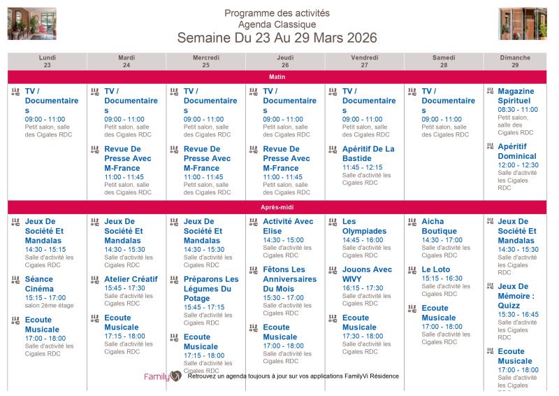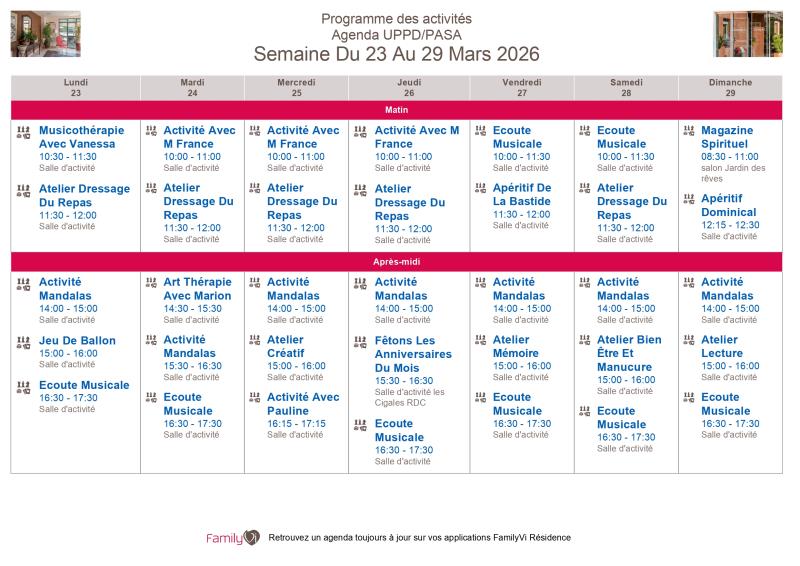 La Bastide du Moulin > Actualités > Cette semaine... Cette semaine... Publiée le 19/03/2026 Chères familles, Voici les plannings d'animations et les menus du 23 au 29 mars 2026