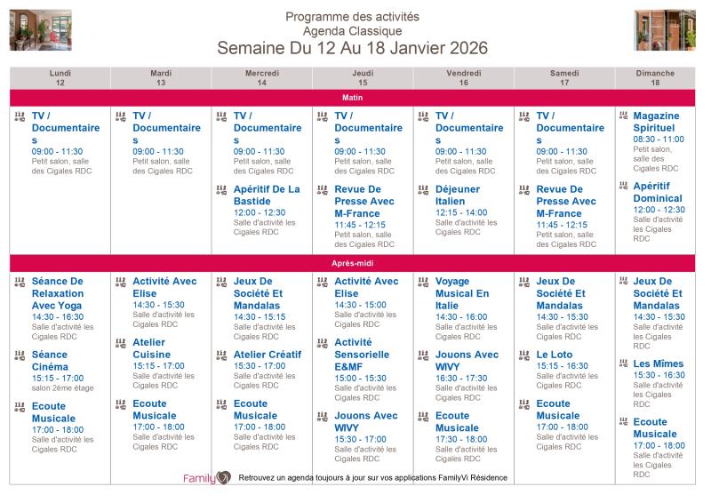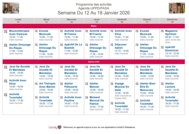 La Bastide du Moulin > Actualités > Cette semaine... Cette semaine... Publiée le 06/01/2026 Chères familles, Voici les plannings d'animations et les menus de la semaine du 12 au 18 janvier 2026