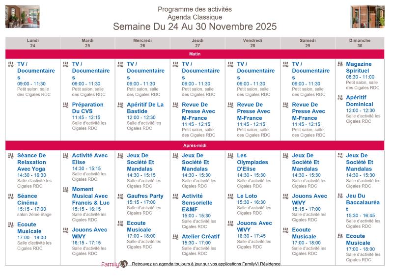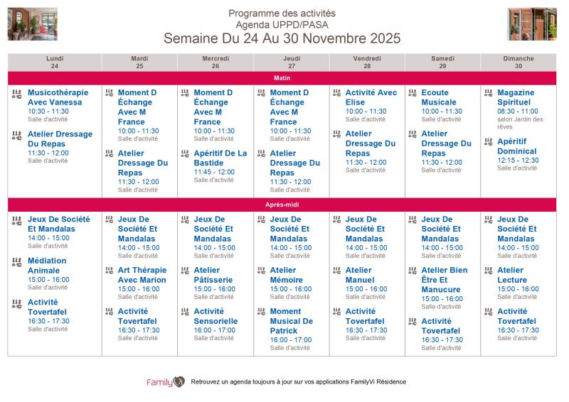 La Bastide du Moulin > Actualités > La semaine prochaine La semaine prochaine Publiée le 18/11/2025 Chères familles, Voici les plannings d'animations et les menus de la semaine du 24 au 30 novembre 2025