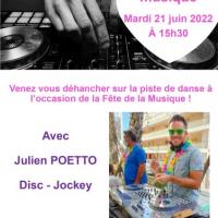 Publiée le 16/06/2022Nous vous invitons à venir célébrer la Fête de la musique édition 2022 à l'occasion d'une après-midi dansante, en compagnie de notre partenaire Julien Poetto, Disc-jockey à Grasse, sur des sonorités Latino, Funk, Club, Rnb, Hip-Hop, Reggae, Rock, Rétro. Il y en aura pour tous les go&uci [...] Lire la suite
