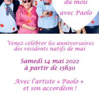 Publiée le 06/05/2022Venez nombreux fêter les anniversaires de vos proches, ce samedi 14 mai, en compagnie de l'artiste Paolo et son accordéon Lire la suite