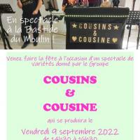 Publiée le 06/09/2022Ce vendredi 9 septembre, la Bastide du Moulin aura le plaisir de recevoir le groupe Cousins & Cousine, venez faire la fête avec les résidents, de 14h30 à 16h30 Lire la suite