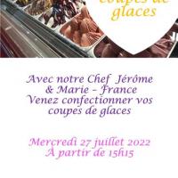 Publiée le 15/07/2022Les résidents sont invités à venir confectionner et à personnaliser leur coupe de glace de toutes sortes de gourmandises, en compagnie de notre Chef Jérôme et de Marie-France l'animatrice, le mercredi 27 juillet à partir de 15h15 Lire la suite
